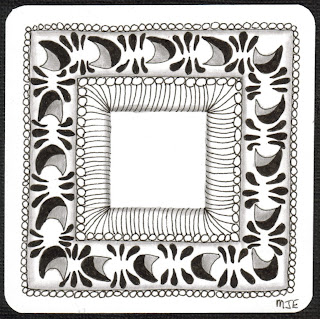 Bird on a branch. I found a new leaf pattern in a colouring book so used it here. I highlighted the berries and some of the small circles with my new Jelly Roll clear star pen. It doesn't show up on the scan but looks gorgeous on the Zentangle. Thanks Diane for loaning me your colouring books for inspiration for new Zentangles.
