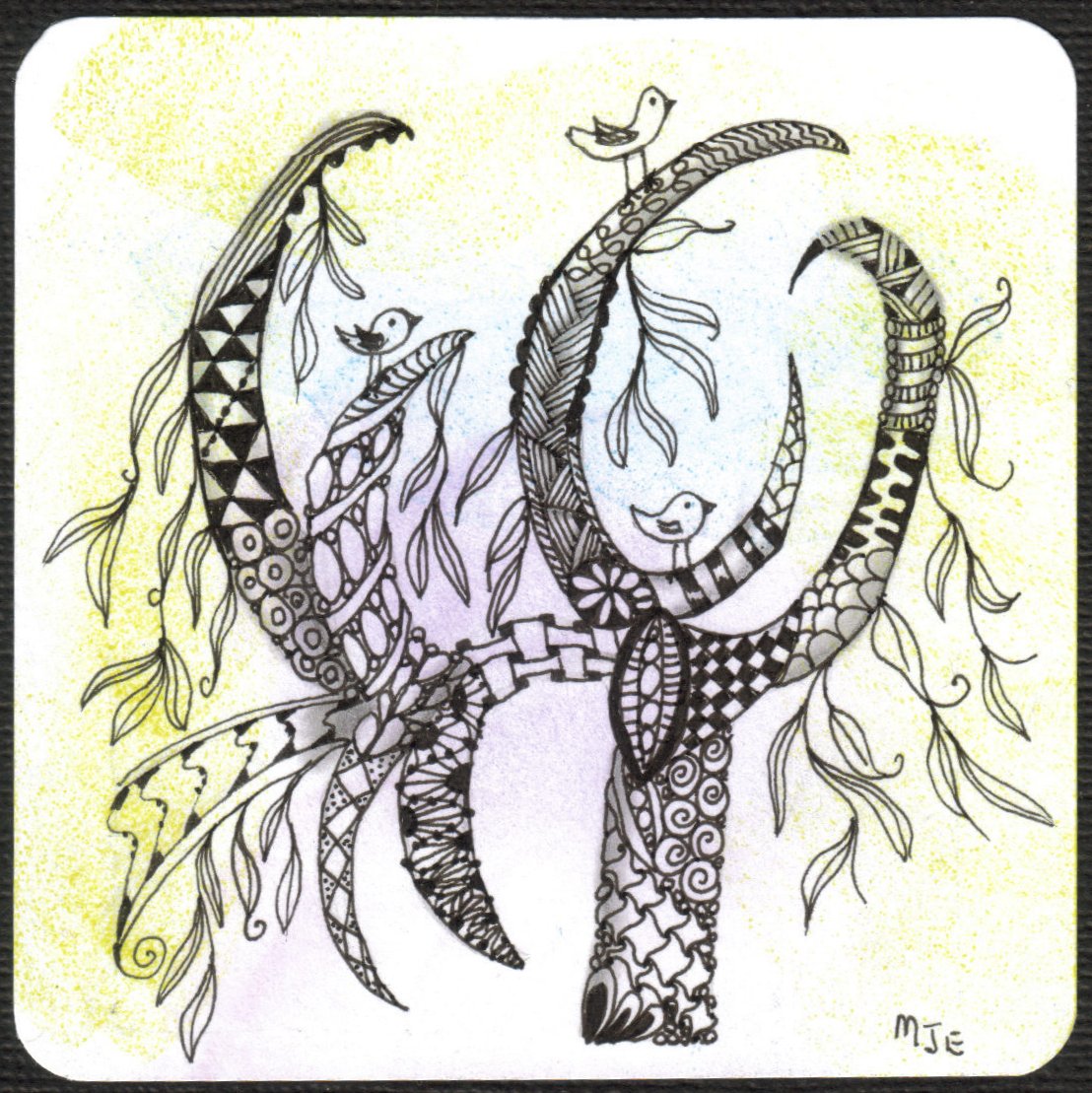 The ZEN BUDS are a tangle by Danni O'Brien. I drew the string of intertwining branches in pencil, overlapping them then drew in the Zen Buds in ink. In pencil, I connected the buds to the branches