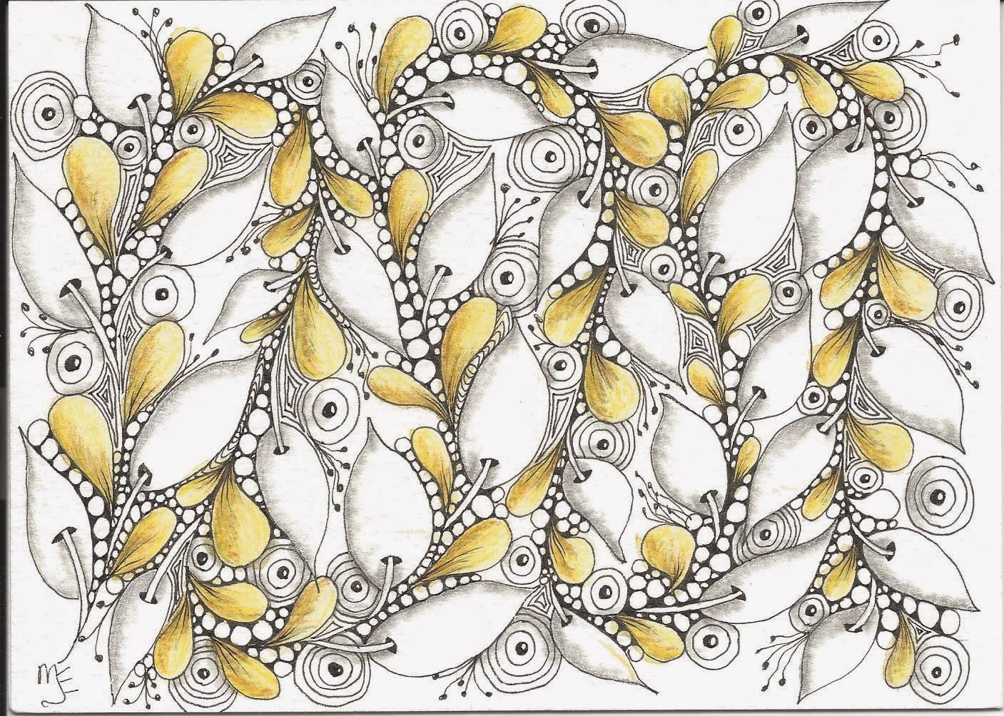 This challenge was to draw the new Official Tangle ING by Molly Hollibaugh. I drew two of them then added some rounding. I filled in the background with Hollibaugh with Zingers on the ends. I then added Printemps, Tipple and some lines and back in some of the shapes. I added some Fescu to the stems of the Zingers.